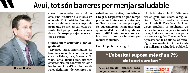 A las puertas de la celebración del Día Nacional de la Nutrición, el Colegio Oficial de Dietistas–Nutricionistas de Baleares organiza diversos actos para concienciar a padres y educadores de que “Enseñar a comer es enseñar a crecer”. Manuel Moñino (Badajoz, 1965), presidente del Colegio en las islas y vicepresidente de la Asociación Española, recuerda que el exceso de peso causa en Europa más de 1 millón de muertes cada año. (Con la colaboración de Obra Cultural SA NOSTRA – entrevista publicada en el Diari de Balears 24/05/15- traducció al castellà)