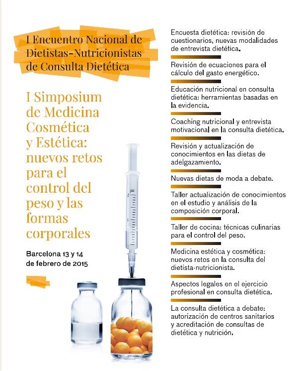 La I Trobada Nacional de Dietistes-Nutricionistes de Consulta Dietètica acollirà el primer Simposi de Medicina Estètica i Cosmètica, convertint-se en un nou marc professional que oferirà al dietista-nutricionista nous models de prestació de serveis sanitaris en consulta dietètica, així com suposarà una gran oportunitat per actualitzar els protocols d'intervenció dietètica i dietètica basats en l‟evidència científica.